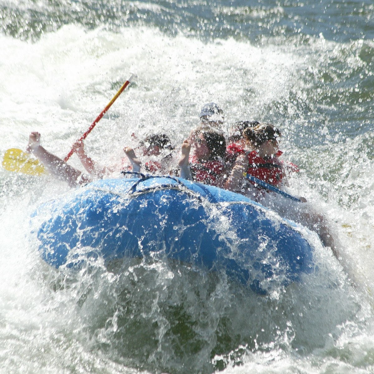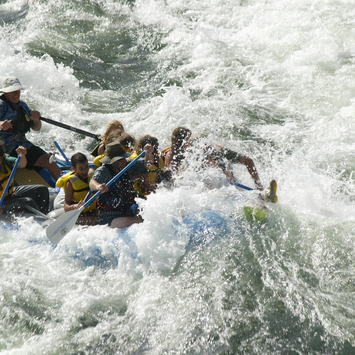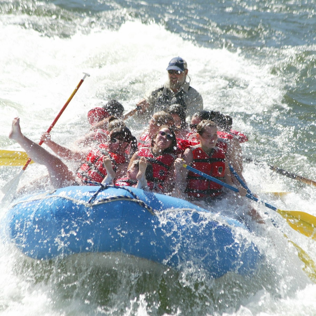 Oar powered rafts are typically scheduled on all extended trips. The guide navigates the rapids and propels the boat through calm sections using a set of oars. An oar powered raft holds 4-6 people plus the guide.