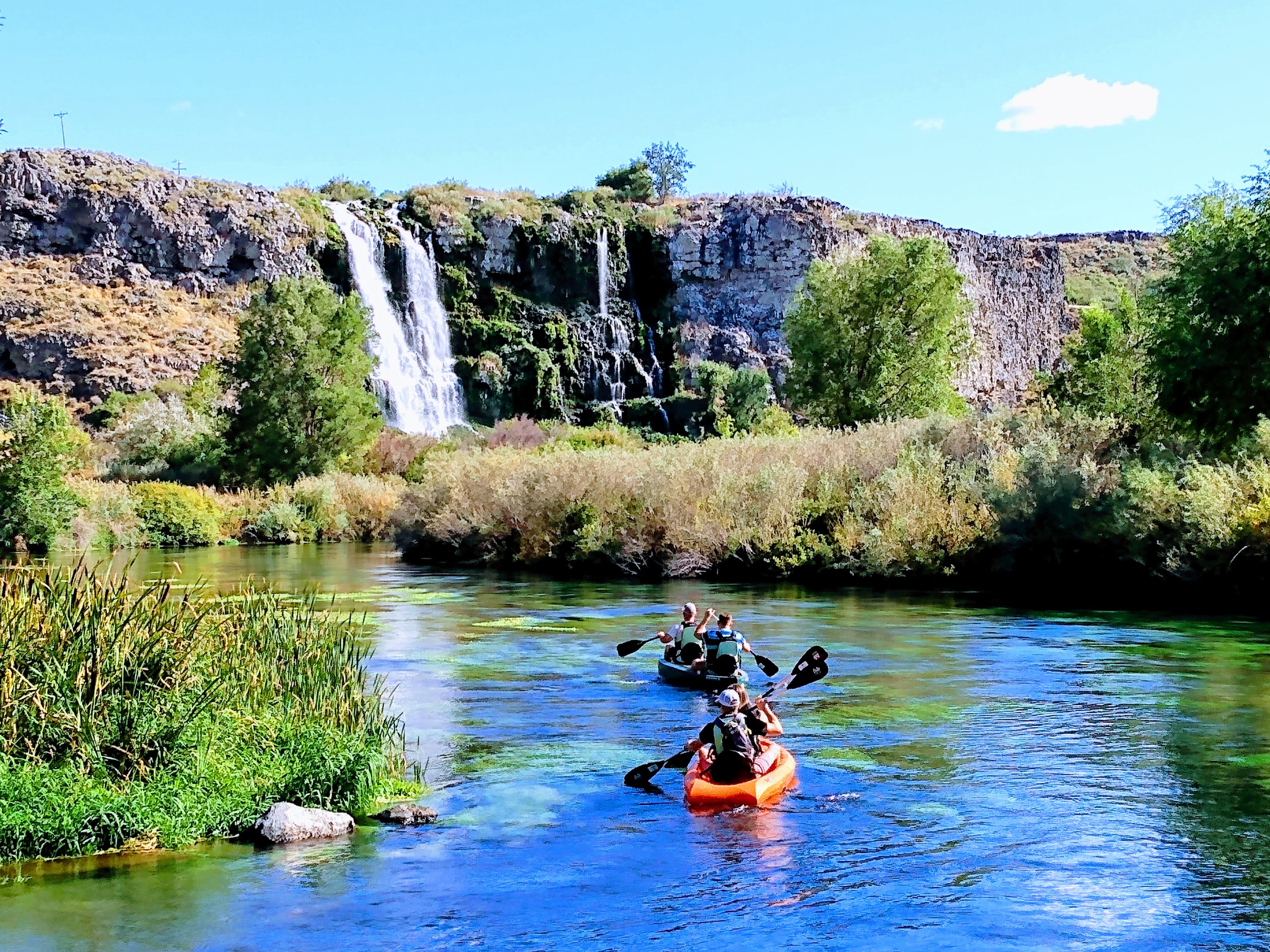 Paddle your own watercraft with a guide down the Snake River. The Thousands Springs Section offers a flat water paddle with an easy down river current. Experience beautiful waterfalls, scenery, waterfowl, and birds of prey. On this trip you will pass by Box Canyon, paddle into Blue Heart Springs, and adventure around Ritter Island. This is a wonderful way to experience the Snake River up close and personal. Recommended for ages 6 and up.